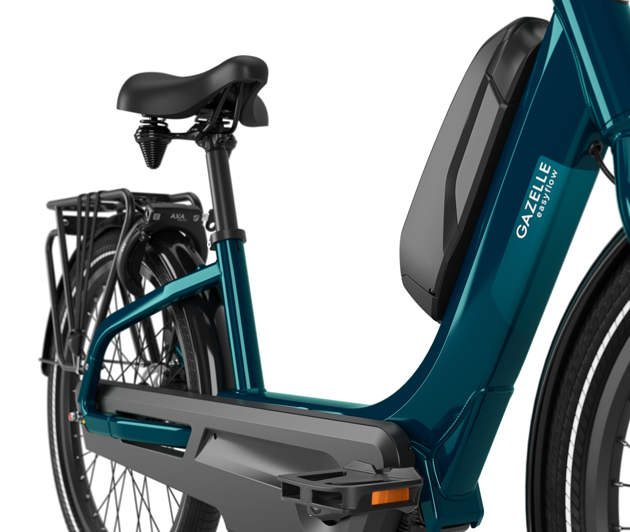 The first thing you notice about the Easyflow is the elongated frame with plenty of space in the middle. There’s a good reason for that. Not only can you get on and off the bike with ease, but you can also easily sit on the saddle with both feet on the ground. This enables you to get on the bike comfortably and set off comfortably in a relaxed, upright riding position.