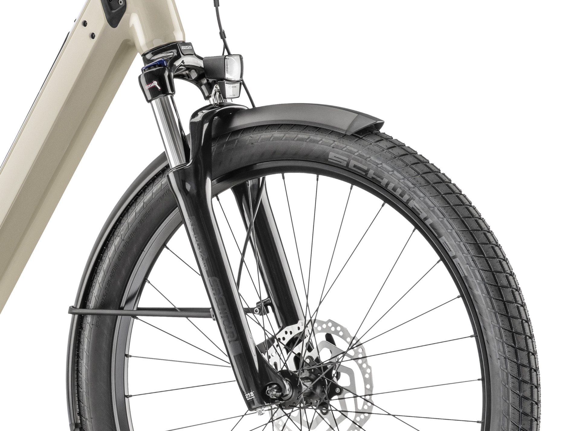 Finally, its 27.5’’ urban Schwalbe Super Moto-X tyres are as comfortable as they are high-performing and durable. Thanks to their wide 2.4’’ section, they won’t get stuck in tram tracks!